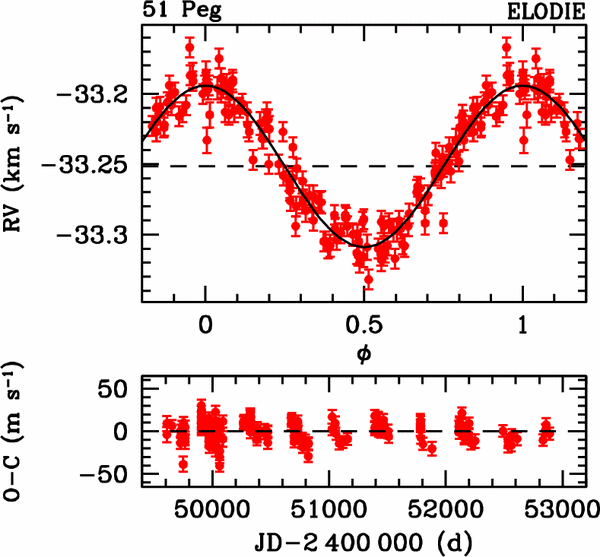 Shéma 2-Planète 51 Pegasi. Ce graphique montre les données qui ont permis de prouver aux astronomes qu'une planète existait. La ligne montre clairement une « oscillation » provoquée par l'attraction gravitationnelle d'une grande planète sur son étoile mère (51 Pegasi).