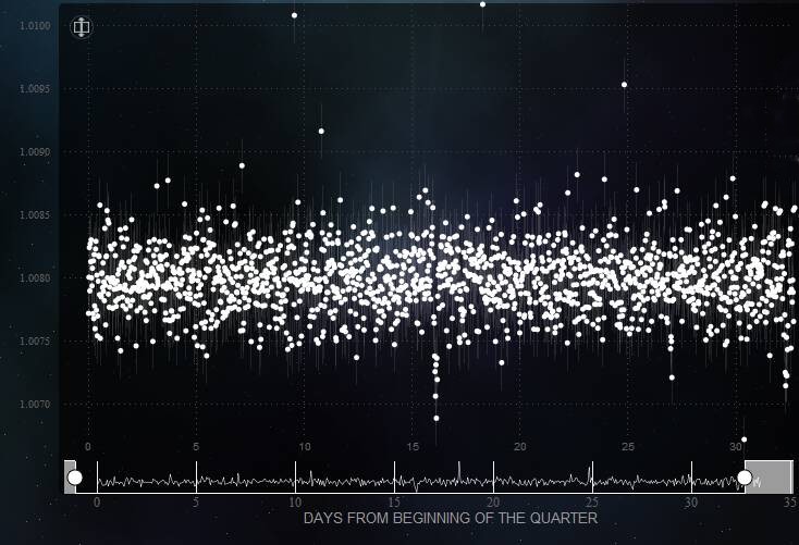 Courbe de lumière d'une étoile naine de magnitude apparente 14,2. La température de surface de cette étoile est de 5 614 Kelvin (soit 5 341 °C), son diamètre représente 80% de celui du Soleil . L'échelle des valeurs en abscisse est ici exprimée en jours. Source : Tutorial du projet planethunters.