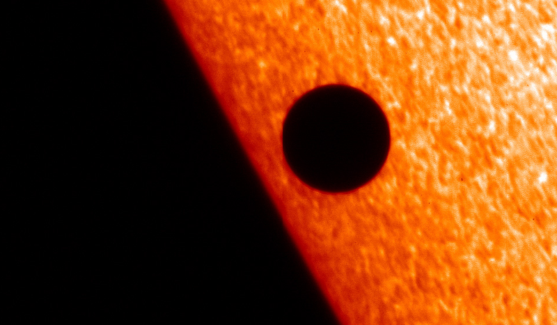 Exemple de transit planétaire à l'intérieur de notre système solaire. Ce cliché montre Mercure passant devant le Soleil en 2006 - Source : Agence Spatiale Européenne - Solar Optical Telescope (télescope spatial de 50 cm de diamètre)