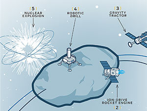 MAIS N'EVACUEZ PAS déjà. Bien que nous ne pouvons forcer Paophis à manquer la Terre après 2029, nous avons la technologie pour donner ce petit coup de pouce qui dévierait sa course bien avant, ce qui aurait pour résultat de faire manquer cette région gravitationnelle à l'astéroïde. D'après la NASA, un simple "projectile à impact cinétique" percutant Apophis à 5000 mph (8000 km/h) suffirait. Nous avons déjà un précédent pour ce genre de mission, appellé NASA's Deep Impact space probe (nommé d'après un autre scénario de collision cosmique (1998)), qui a percuté la comète Tempel 1 en 2005 pour rassembler des données sur la composition de sa surface. Autrement, un engin équipé d'un "tracteur gravitationnel" mu par réacteurs ioniques, pourrait être placé au dessus d'Apophis et utiliser sa propre gravité pour doucement tirer l'astéroïde en dehors de sa trajectoire initiale.