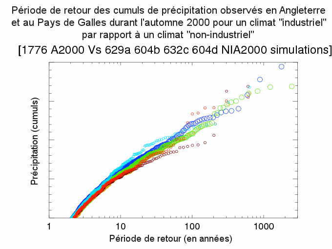 La raison première de cette nouvelle extension est qu'il n'y a que relativement peu de simulations qui reproduisent les évènements vraiment extrêmes. Pour être plus explicite, en ce qui concerne les évènements vraiment extrêmes qui se produisent moins d'une fois tous les 100 ans, il y a relativement peu de simulations qui les reproduisent avec certitude. Les cercles sur le graphique deviennent de moins en moins nombreux et donc de plus en plus "contestables" au fur et à mesure qu'on s'avance vers le côté droit du graphique -- et cela particulièrement pour les cercles les plus petits représentant les différents types de climats "non-industriels" selon 4 SST différentes. C'est ce qui était attendu puisque, par définition, ces évènements sont rares et donc très difficiles à reproduire. Mais les résultats seraient plus "solides" si nous réussissions à calculer une centaine de simulations supplémentaires pour chacun de ces climats.