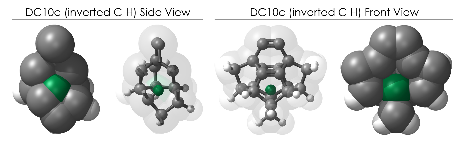 Déformation de ce qui a été minimisé dans un mode alternatif : ## Notes : échec du mode (10) de DC10c. RHF/3-21G présente ce défaut de 3.15 kJ/mol comme plus stable que la pointe d'un outil « normal ». C'est l'un de ces cas potentiellement problématiques, car la nature du défaut n'est pas quelque chose de facilement évitable en reconstruisant la structure de la pointe de l'outil (mais il y a beaucoup à dire sur les obstacles et les hauts niveaux de calcul)