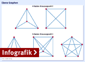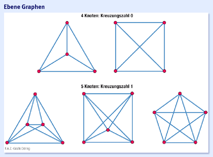 En principe, les graphes possédant un, deux ou trois noeuds peuvent avoir aucun point de croisement. Il est aussi possible de disposer quatre noeuds de telle sorte que les six arêtes ne se coupent nulle part dans le graphe. Ce n'est qu'avec un graphe avec cinq noeuds qu'il y aura au minimum un point de croisement. Plus le nombre de noeuds devient élevé et plus le nombre de croisements augmente rapidement : avec six noeuds, il s'élève à 3 ; avec sept noeuds : 9 ; avec huit noeuds : 19 ; et avec neuf noeuds : 36.