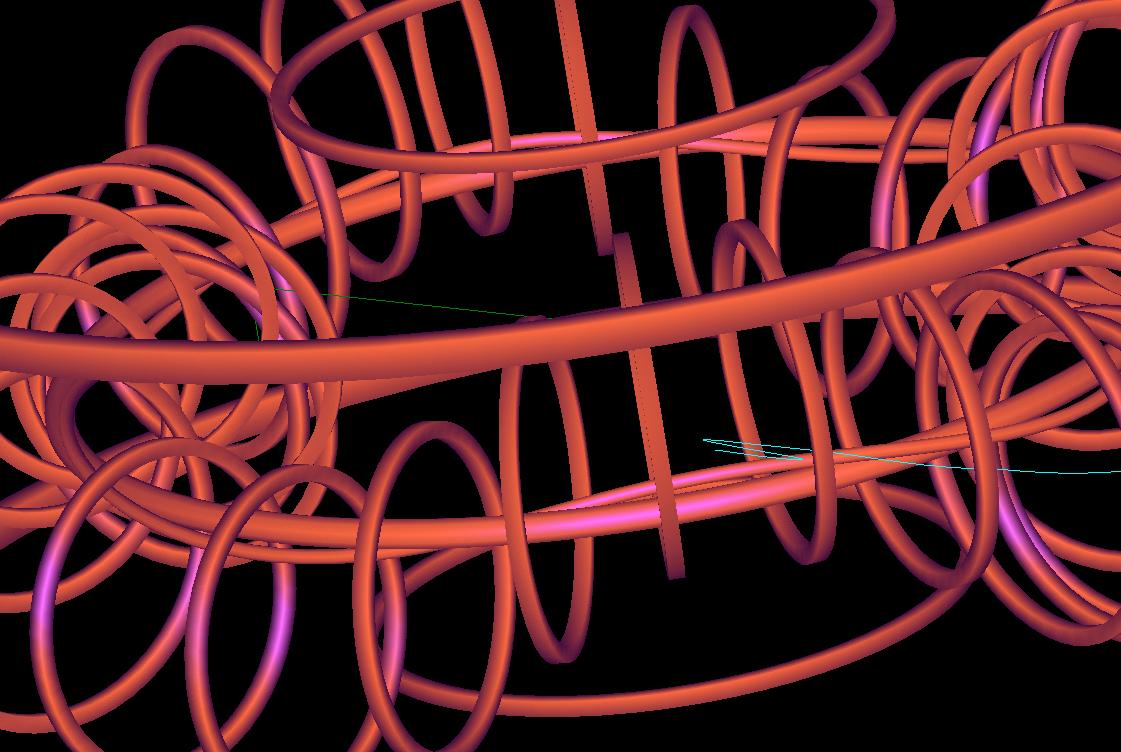 Après plusieurs rotations (habituellement entre 100 et 1000!) les trajectoires des ions ralentissent progressivement et demeurent prisonnières dans ce que l'on appelle un "puits magnétique", entre 2 bobines là où le champ magnétique est plus intense. C'est là qu'elles "dérivent" vers l'extérieur, jusqu'à ce qu'elles rencontrent un mur de la chambre, comme vous le voyez ci-dessous :