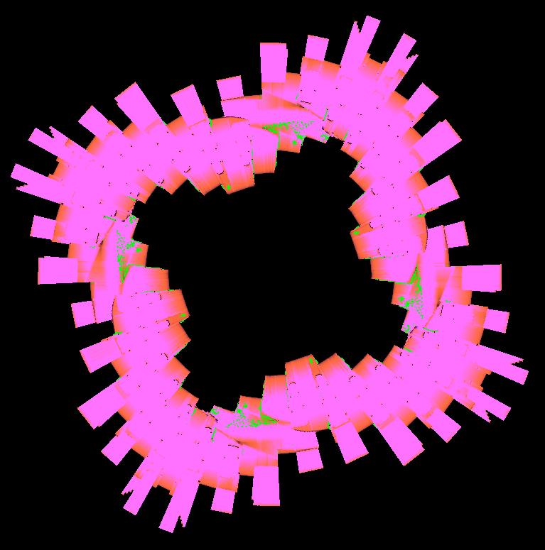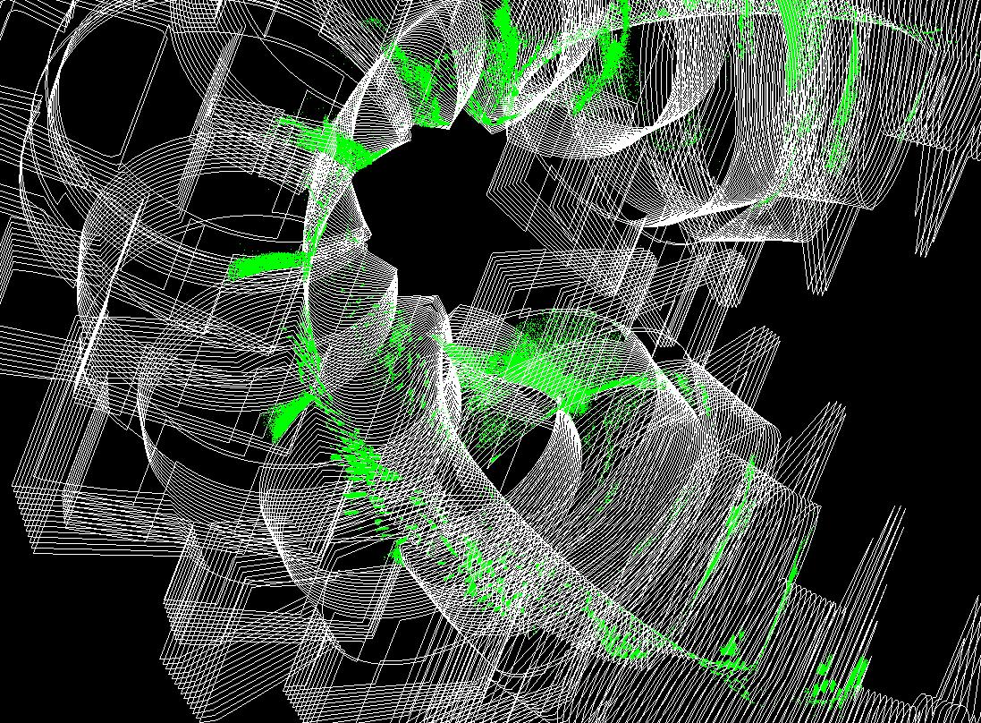 Nous pouvons apercevoir différents modèles au niveau des points d'impact. Par exemple, cette série de bandes radiales s'explique très simplement : toutes les trajectoires que vous calculez, finissent tôt ou tard comme celle que vous voyez dans l'image ci-dessous :